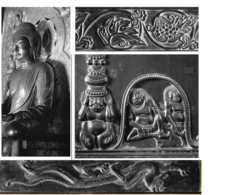 上段の宝珠を手にした双龍を中段で懸命に支える力士。この力士が薬師如来坐像台座の鬼神に相当するのでは、と思った瞬間、サフラン酒の葡萄唐草文様、四神、十二支、そして力士の装飾と、奈良の薬師如来坐像台座の上框(かまち)の葡萄唐草はじめ装飾との見事なまでの一致に気づきました。